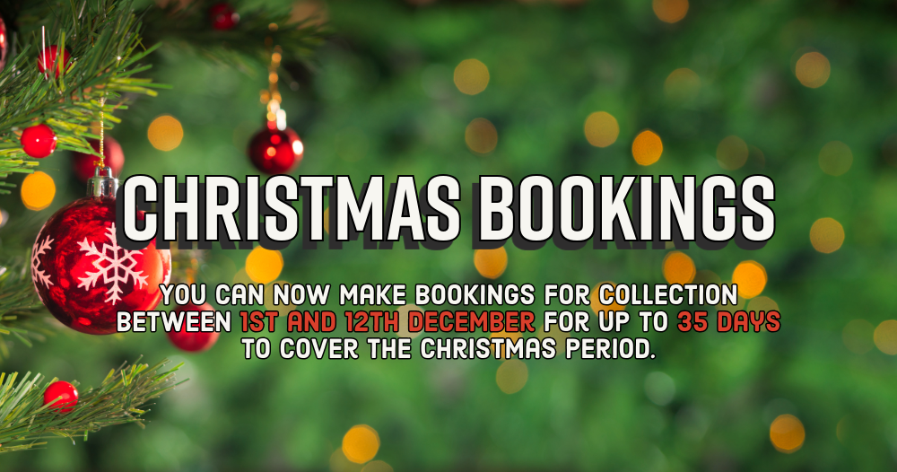 AnnouncementsYou can now make bookings for collection between 1st and 12th December only. Please note: the loan duration is set for 35 days to cover the Christmas period. Bookings can be made up to 30 days in advance of the collection date.